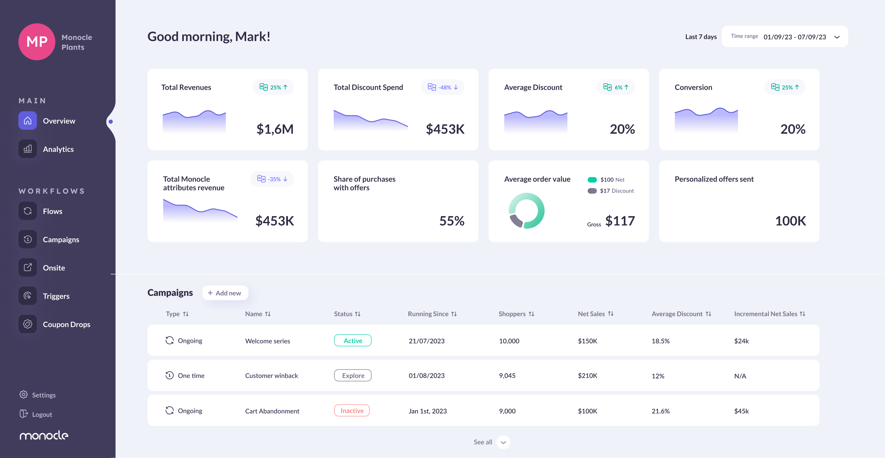 The system is structured to give users comprehensive insight and control over customer journeys. It provides clear visualization of how Monocle processes real-time behavioural signals to inform critical decisions, enabling users to easily monitor and manage the personalized timing, frequency, content selection, and minimum effective incentives applied to each subscriber journey.